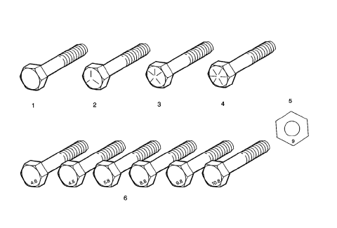 The most commonly used metric fastener strength property classes are 9.8 and 10.9. The class identification is embossed on the head of each bolt. The English, inch strength classes range from grade 2 to grade 8. Radial lines are embossed on the head of each bolt in order to identify the strength class. The number of lines on the head of the bolt is 2 lines less than the actual grade. For example, a grade 8 bolt will have 6 radial lines on the bolt head. Some metric nuts are marked with a single digit strength identification number on the nut face.